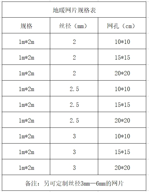 通常使用的地暖網片規格為絲徑2mm,網孔10cm×10cm,長寬1m×2m。
